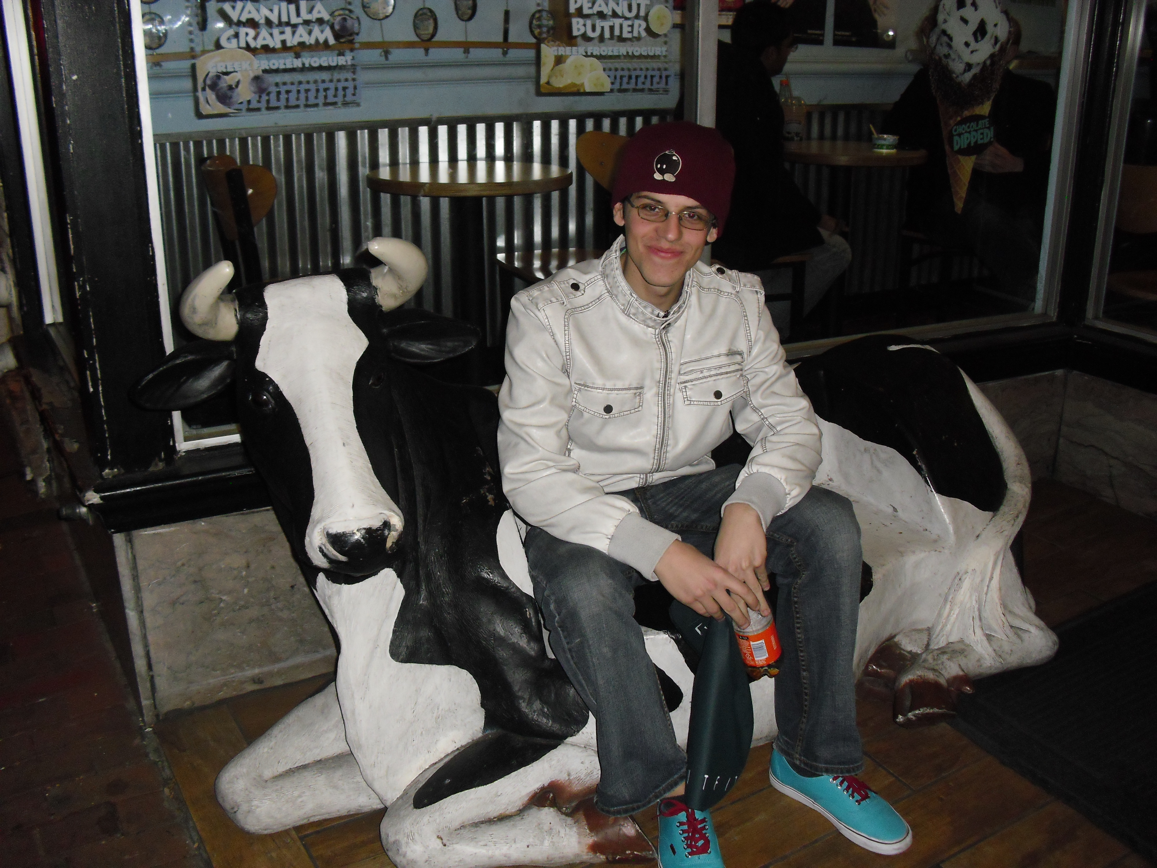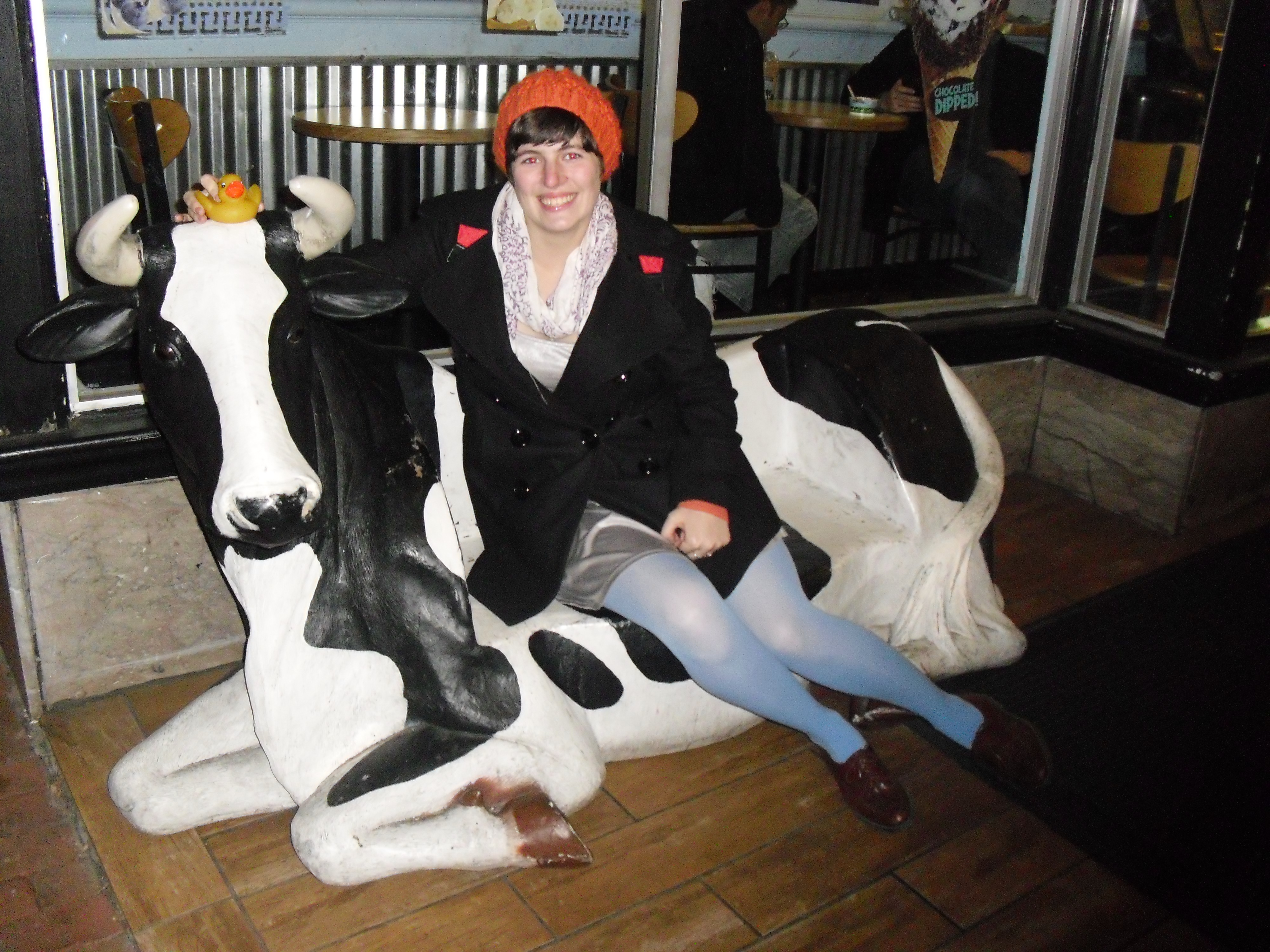 So I went to Washington D.C. while I was on Christmas Break from college.  I had exponential fun times walking around with my man.  We took the metro in from close to Dulles after dropping my dad off at the airport.  Have I mentioned how much I love the Metro and other train related travel?  Well, I love trains!  I think they are ridiculously fun to ride on.  They rival my fascination with escalators…movable steps, why do people walk on those things?!?!  While in D.C. we decided  to ride the Circulator Bus to Georgetown, which was a good idea because it’s very cheap only $1!  On the other hand the bus ride which should have taken twenty to thirty minutes tops, took upwards of one and a half to two hours due to traffic rerouting allowing for some quality talking time and random act of kindness to a stranger!  Always a good thing!  While in Georgetown I found this awesome cow bench outside of Ben and Jerry’s!!!  We also saw two rats…one alive and one dead; some of my worst fears there were so icky and creepy!